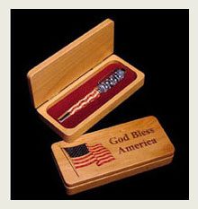 With over 20 years of woodworking experience, the products of Ken Nelsen at Kallenshaan Woods range from key chains to plaques to business card holders to pen cases and pen engraving for penturners throughout the country. "I'm a woodworker by trade and try to stay within the wood arena while using the laser, but I keep coming up with new and interesting things to do with the system." One of Ken's most popular product lines are the wood-turned pens he designs. Using a combination of natural and painted woods, Ken is able to create unique designs on pens. For example, his American Flag design is a beautiful combination of inlaid stars and stripes in an engraved pen.